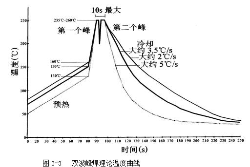 印制板繼續向前運行,印制板的底面首先通過第一個熔融的焊料波。第一個焊料波是亂波(振動波或紊流波),將焊料打到印制板的底面所有的焊盤、元器件焊端和引腳上;熔融的焊料在經過焊劑凈化的金屬表面上進行浸潤和擴散。之后,印制板的底面通過第二個熔融的焊料波,第二個焊料波是平滑波,平滑波將引腳及焊端之間的連橋分開,并去除拉尖(冰柱)等焊接缺陷(圖3-2是雙波峰焊錫波)